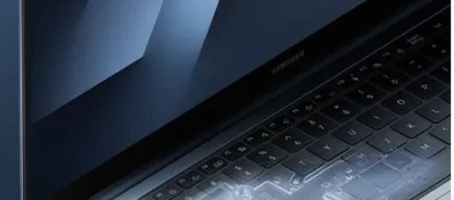 Samsung Galaxy Book6 Pro laptop showing sleek silver chassis and high-resolution display with Intel Panther Lake branding.
