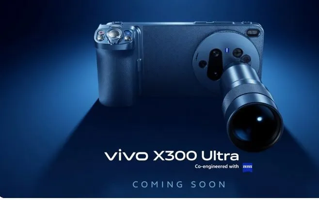 Vivo X300 Ultra flagship smartphone in Titanium Grey featuring a large ZEISS circular camera module and curved OLED display.